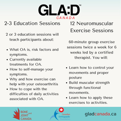GLA:D Canada, developed in Denmark, is an 8-week education and exercise program designed for those with pain or stiffness in your hips or knees, and those with knee and/or hip osteoarthritis. This program offers participants the tools to move forward with a prescribed exercise program, a personalized approach to improving joint mobility and strength, with an understanding of osteoarthritis.